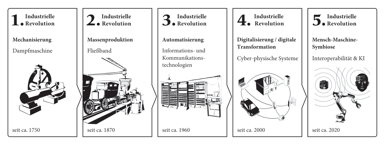 Dem Übergang zur Digitalisierung und zur digitalen Transformation gingen drei industrielle Revolutionen voraus (siehe Abbildung). Jede dieser Revolutionen hatte Auswirkungen auf die Wirtschaft, Gesellschaft und Politik. Seit Anfang der 2000er Jahre sind wir Teil der vierten industriellen Revolution – der digitalen Transformation. Diese Revolution ist gekennzeichnet durch die «Vernetzung von allem mit allem». Das Internet und die neuen Informationstechnologien im Allgemeinen schaffen eine Abhängigkeit von der Technik, wie sie die Gesellschaft noch nie erlebt hat. Seit den 2020er Jahren haben die kontinuierlichen Fortschritte in der Technologie (vor allem in der KI) und der gesellschaftliche Wandel die Vorstellung von einer sich abzeichnenden fünften industriellen Revolution ausgelöst, welche die Symbiose zwischen Menschen und Maschinen/Robotern fördern wird.