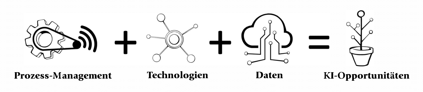 Die KI-4-KMU-Methode schliesst an frühere Forschungsprojekte an (siehe Informationsbox) und kombiniert die drei Handlungsfelder Prozess-Management, neue Technologien und Daten der digitalen Transformation (siehe Abbildung), damit Organisationen strategische KI-Opportunitäten identifizieren und nutzen können.